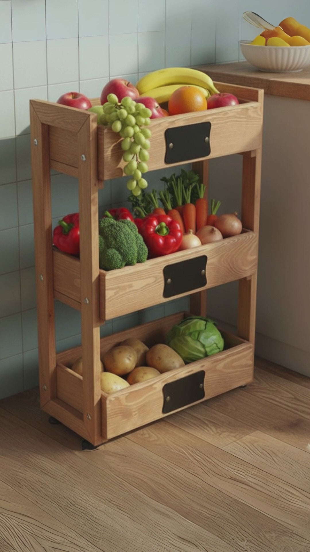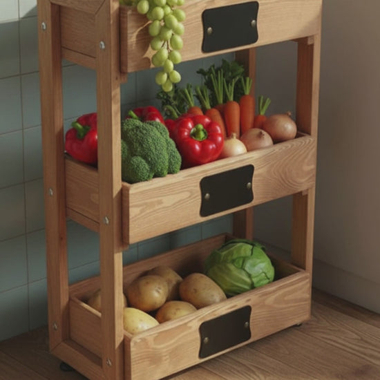 Mutfağınıza hem şıklık hem de düzen katmak için tasarlanmış bu doğal ahşap sebzelik ile tanışın! Meyve ve sebzelerinizi tezgah üzerinde dağınık durmaktan kurtarıp, taze kalmalarını sağlayacak ideal bir çözümdür.